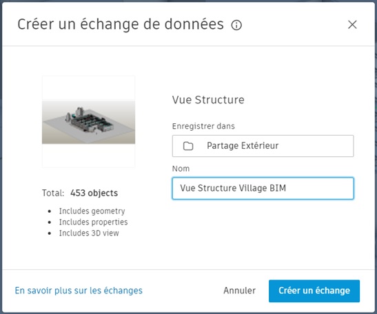 Nota: vous pouvez créer un échange de données uniquement à partir de vues 3D publiées de Revit 2023* sur la plateforme Autodesk Docs.