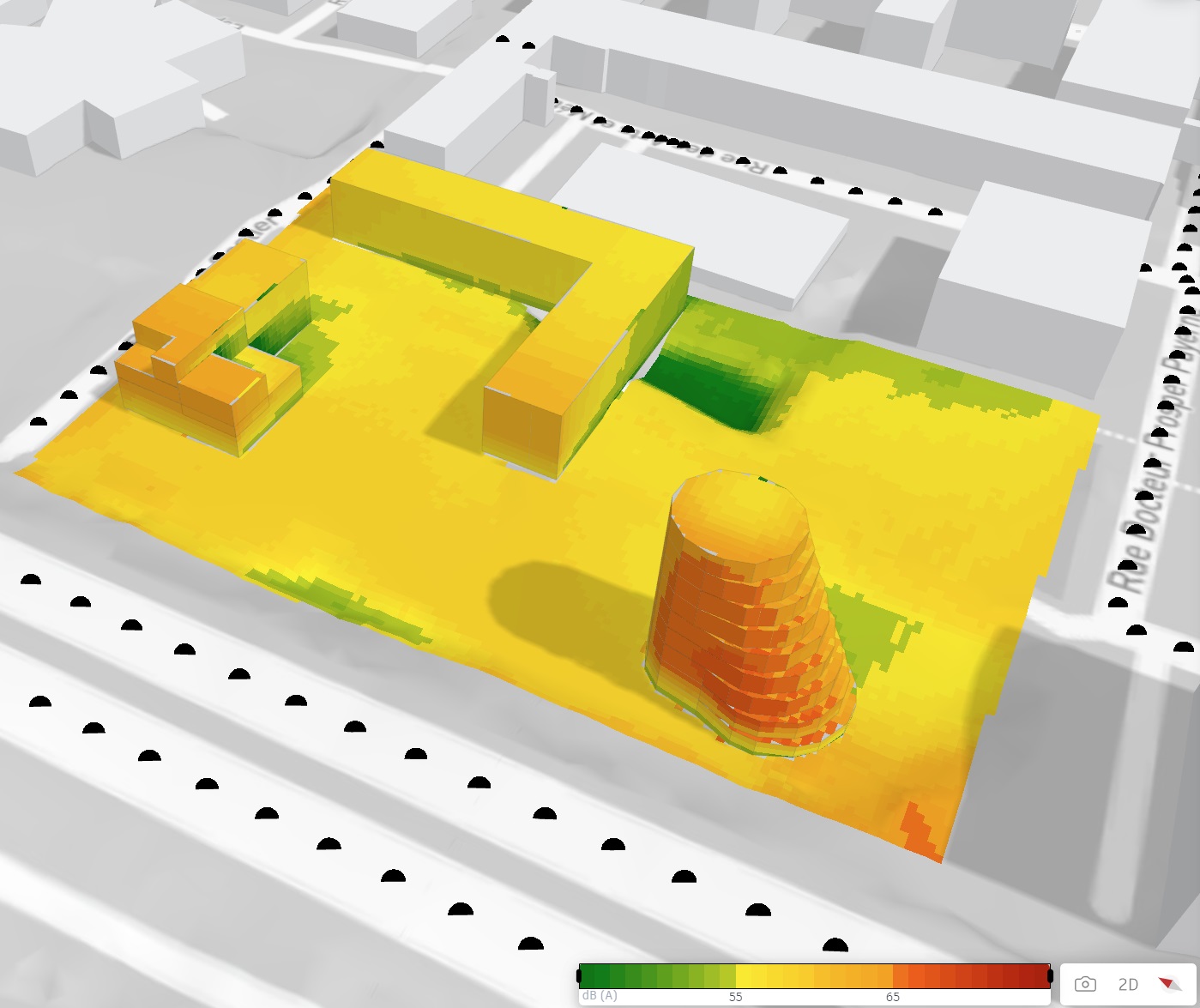 Depuis fin juin 2023, Autodesk Forma propose l’analyse rapide et détaillée du bruit provenant du trafic routier. Cette analyse fournie des valeurs en décibel (dB) au niveau du terrain, des façades et des toitures.