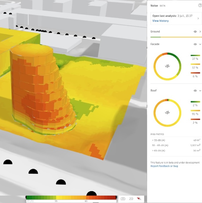 Autodesk Forma propose en version bêta l’analyse du bruit d’aménagement urbain (voir ici l’article Village BIM). Depuis quelques jours, cette analyse offre des statiques afin que les utilisateurs puissent obtenir un aperçu plus clair de la distribution des niveaux de bruit.