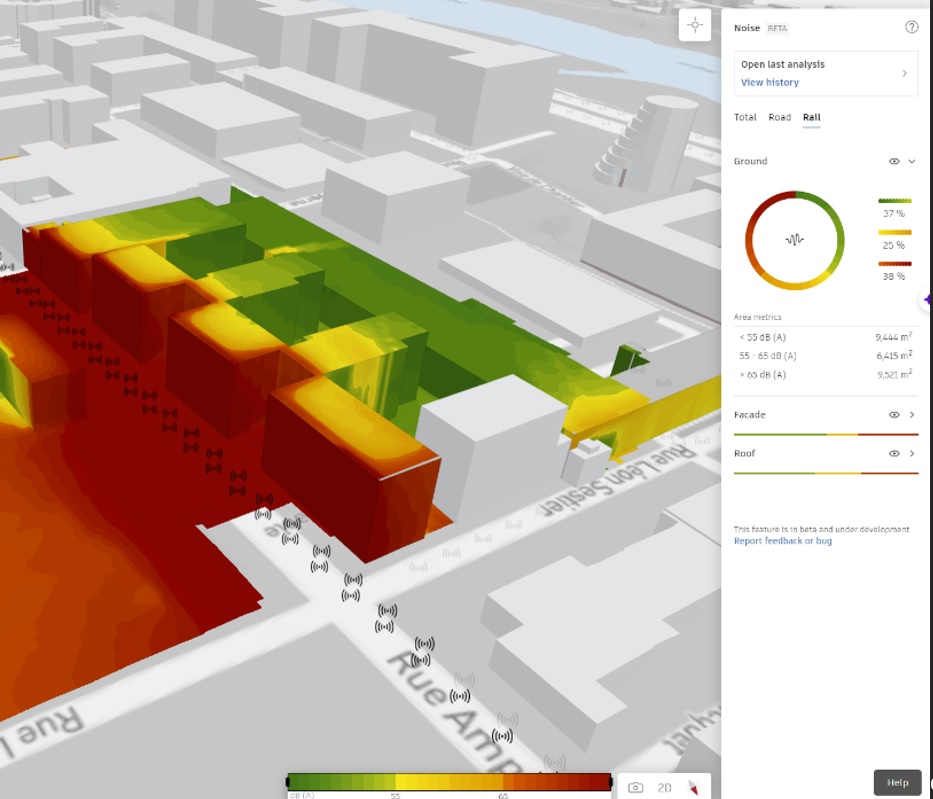 Ça vient de sortir, l’analyse du bruit* d’Autodesk Forma permet d’étudier les nuisances sonores issues des transports sur rail de type trains, trams et métros.