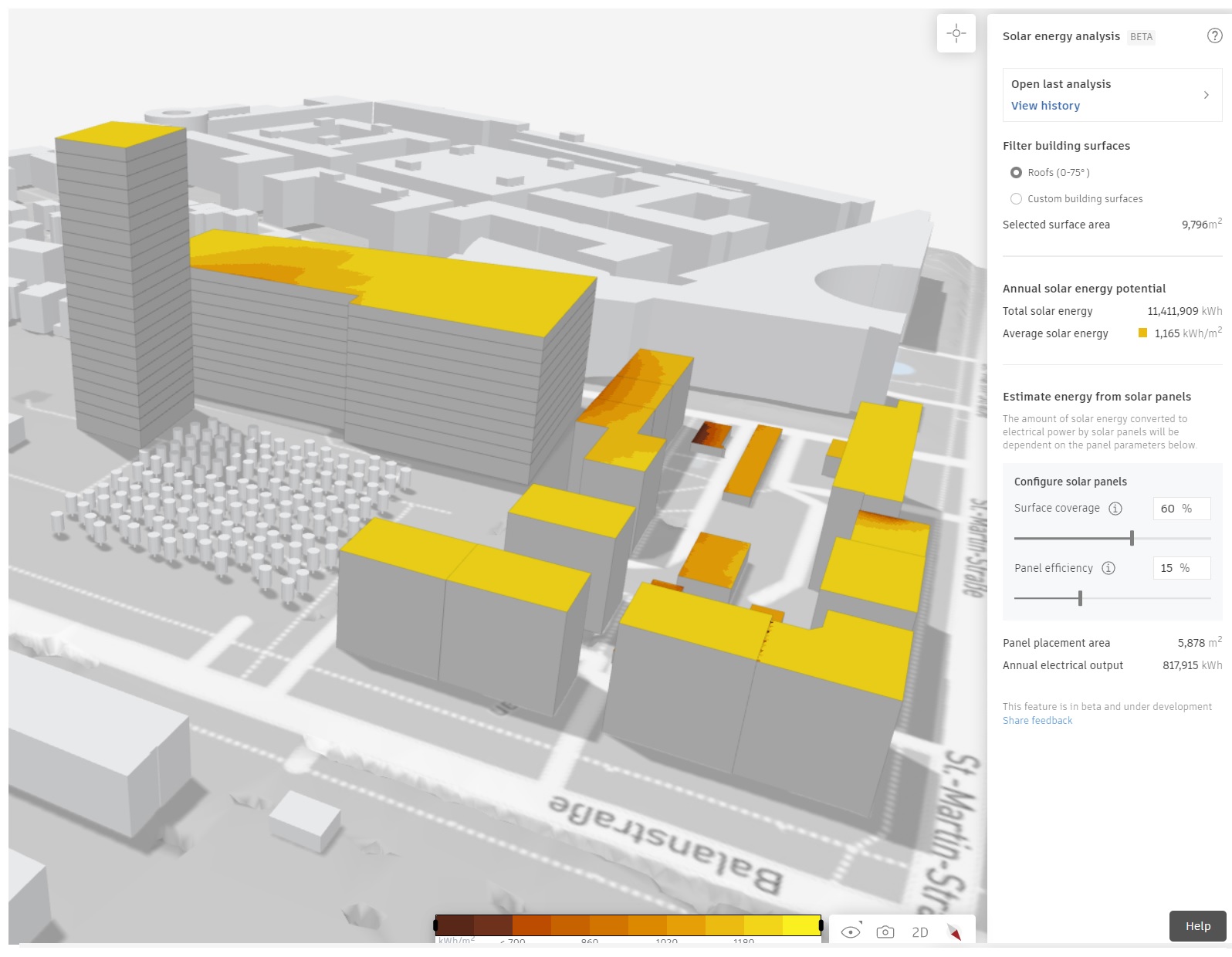 Désormais, vous pouvez analyser en détail les résultats en réalisant un filtre en sélectionnant graphiquement les surfaces concernés. Cela vous permet d’affiner les valeurs de l’analyse solaire exprimée en kWh/m.