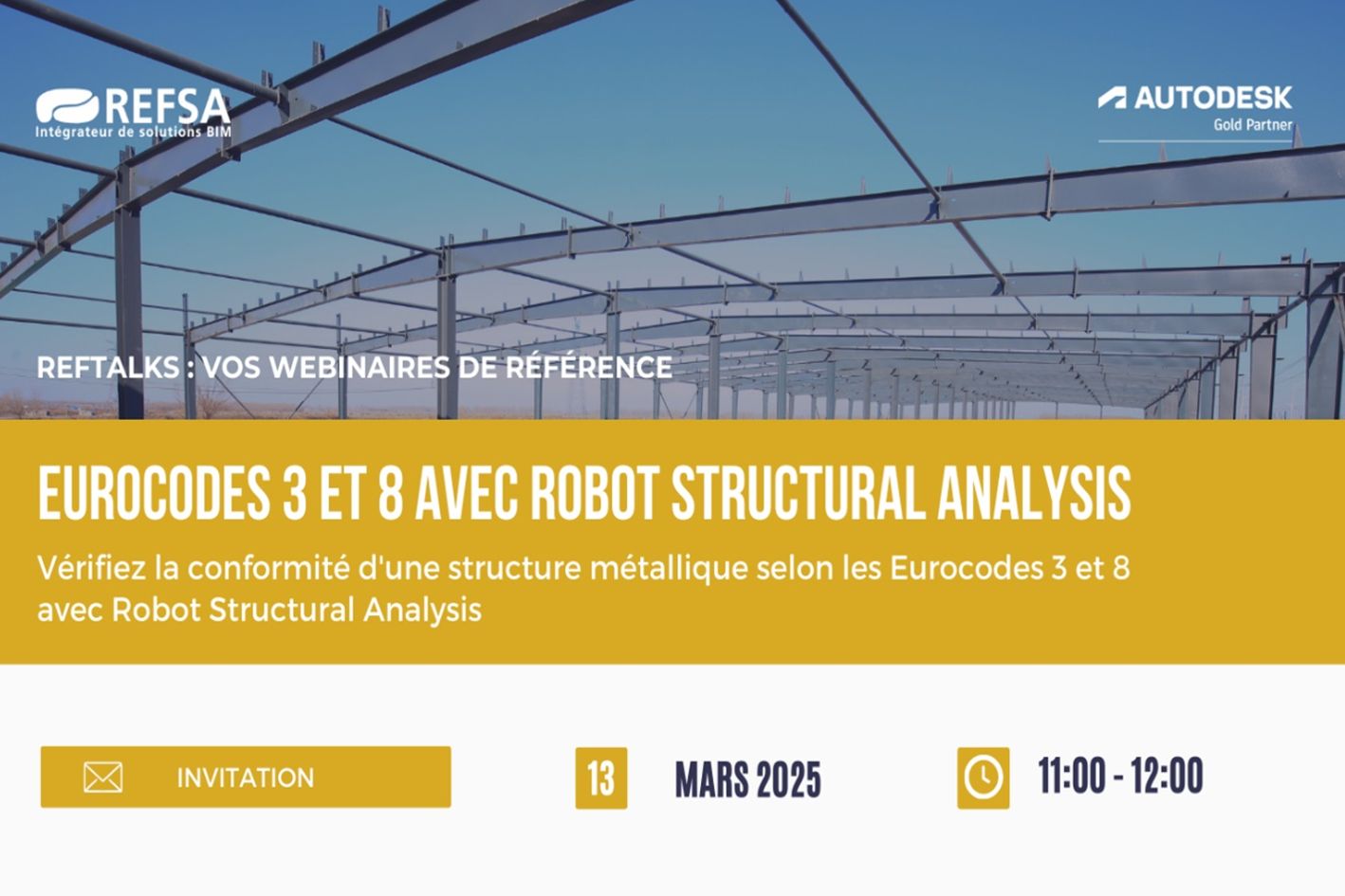 La société REFSA, partenaire Gold, revendeur des solutions Autodesk, vous invite à un webinaire le 13 mars à 11h00 un webinaire sur les vérifications structurelles concernant les Eurocodes 3 et 8 avec le logiciel Autodesk Robot Structural Analysis.